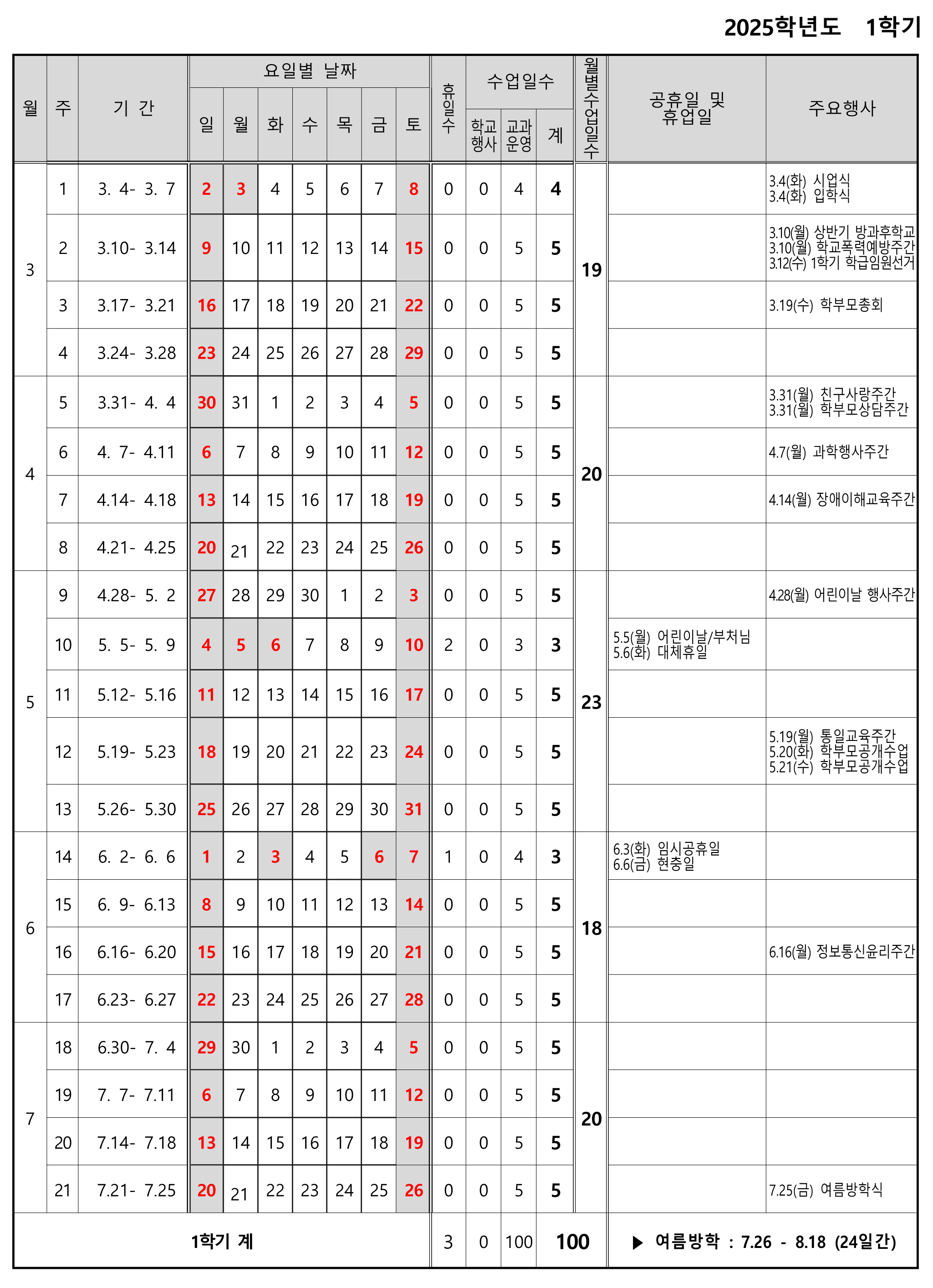 여름방학기간 | 2025.07.26.(토) - 2025.08.18.(월) | 24일 |